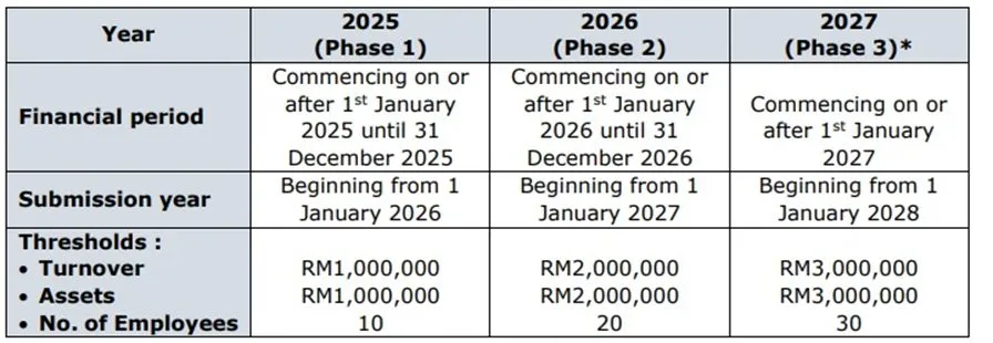 (1) If your company has a financial year ending on 31 December, Practice Directive 3/2017 will apply to financial statements for the year ending 31 December 2024. The new guideline, Practice Directive 10/2024, will take effect for financial statements for the financial year ending 31 December 2025, covering the period from 1 January 2025 to 31 December 2025. However, the threshold criteria will be implemented gradually, as outlined below.
